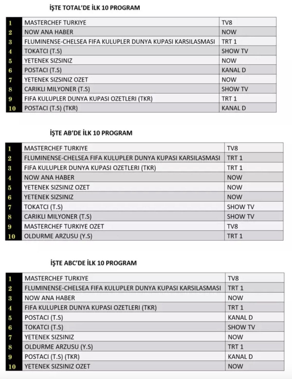 Her gün bir önceki güne ait Total, AB ve ABC sıralaması belli olurken dünün reyting sonuçları merakla bekleniyor.