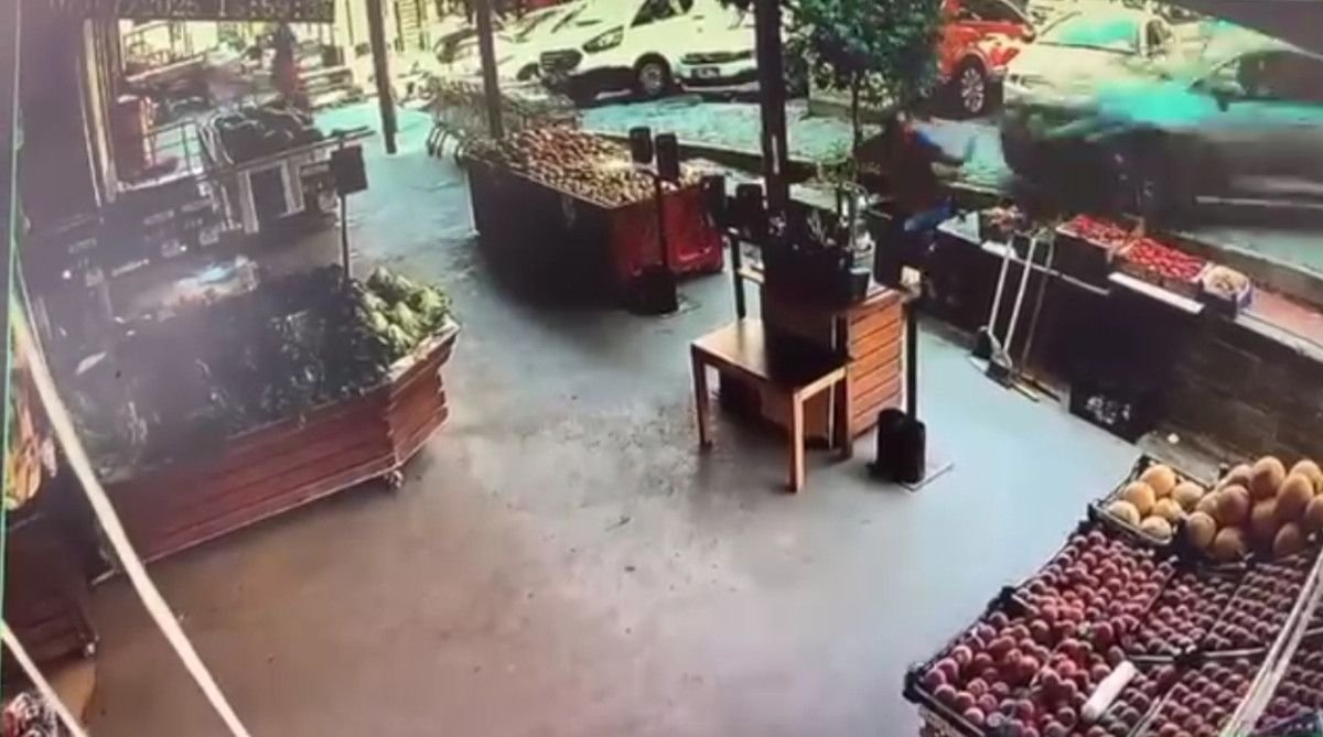 Kaza anında kaldırımda oturan market çalışanı, aracı fark ederek refleksle kendini yere atmaya çalıştı.