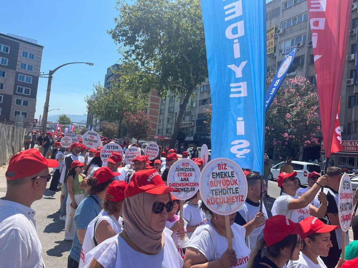Bu kapsamda Belediye-İş Sendikası’na bağlı işçiler, sendika binası önünde toplanıp, Başkan Cemil Tugay’ın ofisinin de yer aldığı Egemenlik Binası’na yürüdü.