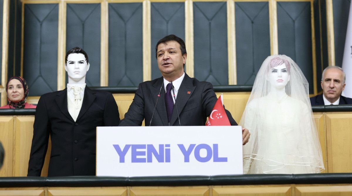 Kürsünün iki yanına gelinlik ve damatlık giydirilmiş cansız mankenler yerleştiren Arıkan, evlilik çağındaki gençlerin ekonomik nedenlerle aile kuramadığını söyledi.