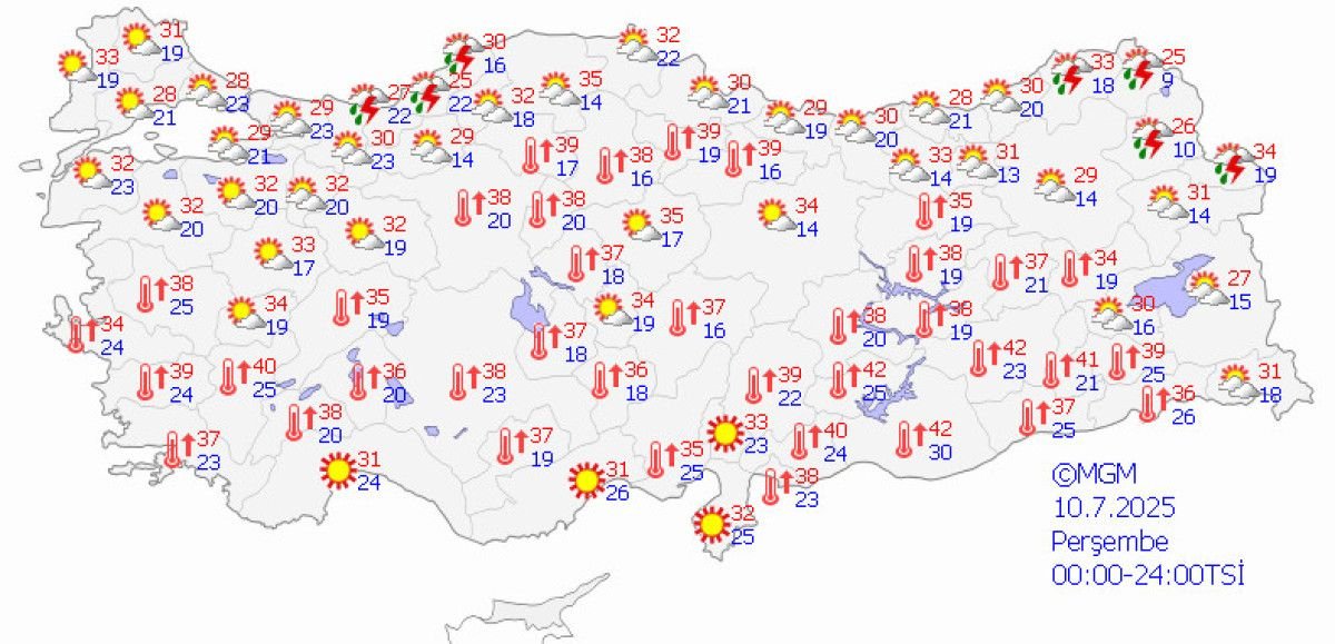 Bugün, 10 Temmuz Perşembe günü, ülke genelinde sıcaklıkların 24 ile 39 arasında değiştiği görülüyor.